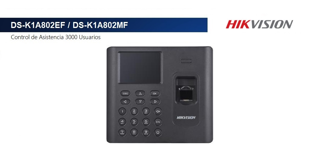 • DS-K1A802EF/ DS-K1A802MF: Dispositivo autónomo de Control de acceso y asistencia con huella o Tarjeta. Capacidad 3.000 huellas y 100.000 registros. Configuración de hasta 32 horarios diferentes. Conectividad WIFI, RJ45, USB.