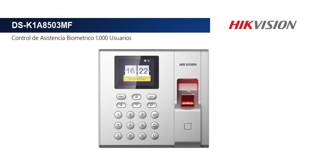 • DS-K1A8503MF: Lector huella, tarjeta Mifare y teclado. Capacidad para 1000 huellas y 100.000 registros. Configuración de hasta 32 horarios. Comunicación TCP / IP. Descarga los informes de asistencia mediante una unidad flash USB.