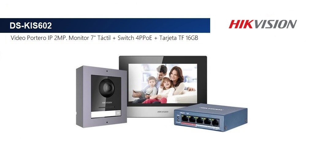 • DS-KIS602: Kit de videoportero IP con camara de 2MP, ideal para intemperie. Monitor LCD a color 7" de 2MP. Incluye Switch 4 Puertos PoE y Tarjeta TF 16GB.